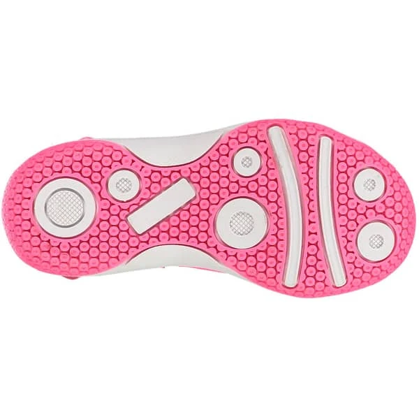 Lightweight and durable, this sandal has a leather upper with some synthetic fabric inserts and a textile lining. The perforated design allows air to pass through, yet the sandal is protective of a small child’s fragile foot. Easy to slip on and off with a hook and loop closure, this shoe provides a snug fit and support for kids to run, walk and jump with ease.