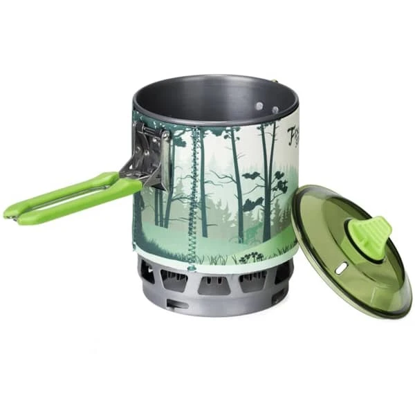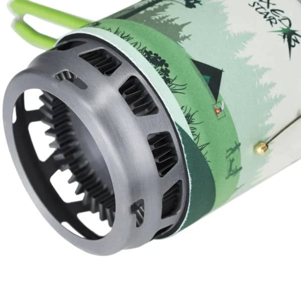 The advantage of the 0.8 litre stove is that it can boil water 30% faster than a traditional camp stove. Made ofsturdy anodised aluminium, this pot has a lockable stainless steel handle for easy handling during cooking. When stored, the handle folds over the lid and is held in place by a braided steel wire system. For use on rough terrain, a folding cartridge holder provides a stable base, while a pan holder is also included.