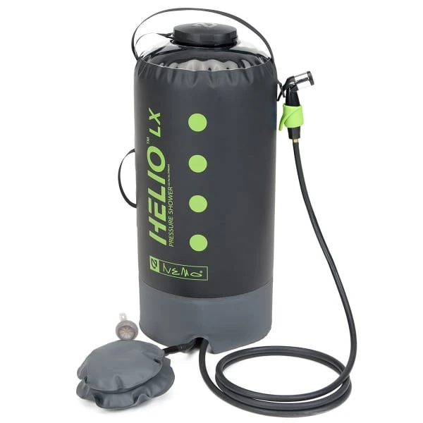 Unlike gravity camp showers that have to be hung overhead and produce lousy water pressure, the HELIO LX from Nemo Equipment is a solar powered travel shower that sits firmly on the ground and provides the pressure needed for a good shower.
