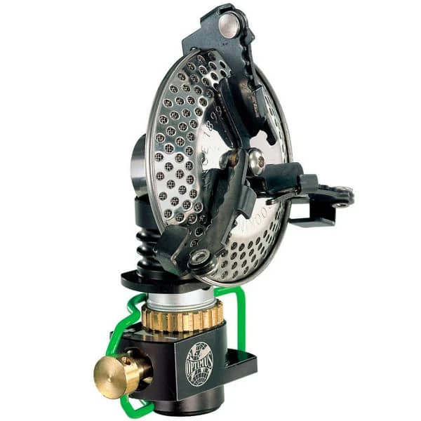 The compact Crux has folding burner heads, transforming it into a small little beauty that actually snuggles right up into the cavity at the bottom of your gas cartridge.